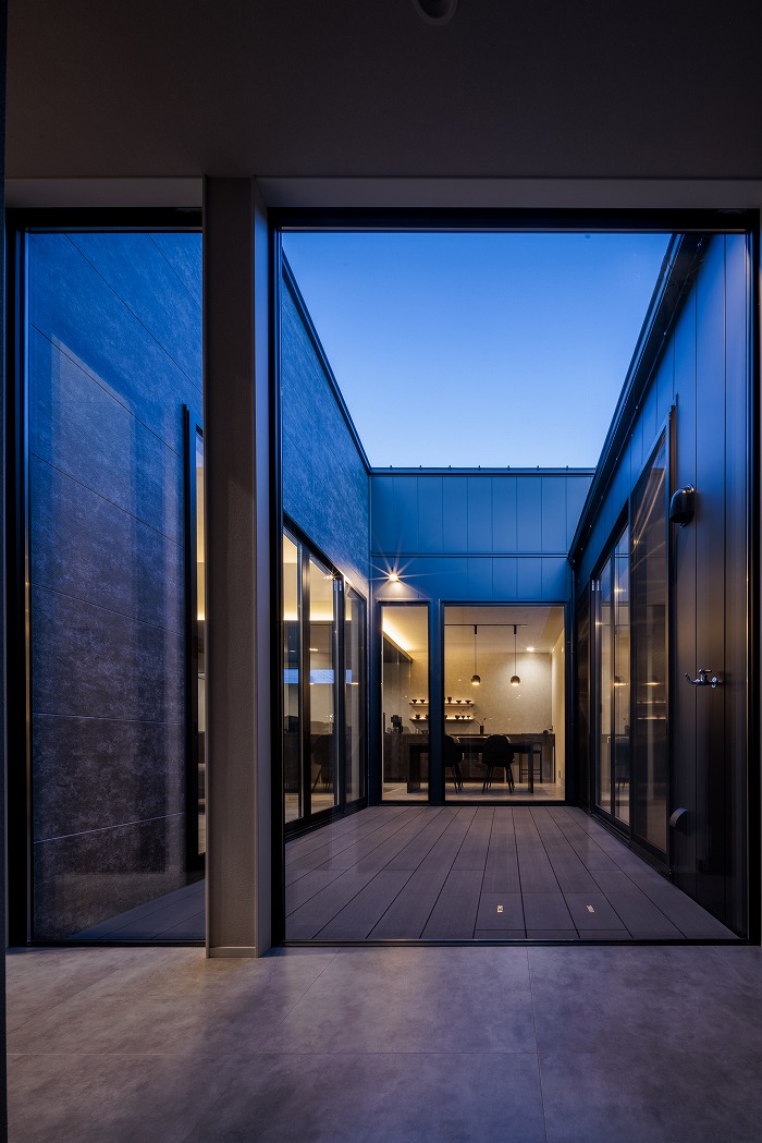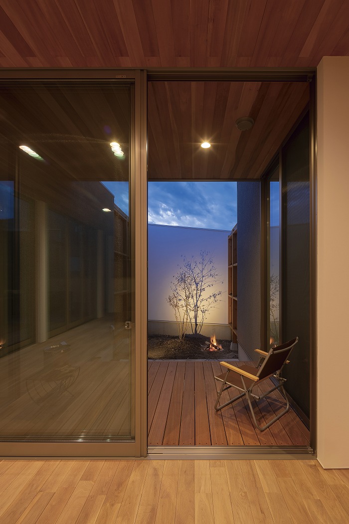 家の中央に配置された中庭が特徴的な家。採光性と通気性が確保できると同時に、カーテンがなくてもプライバシーが守られ、気持ちよく生活することができます。