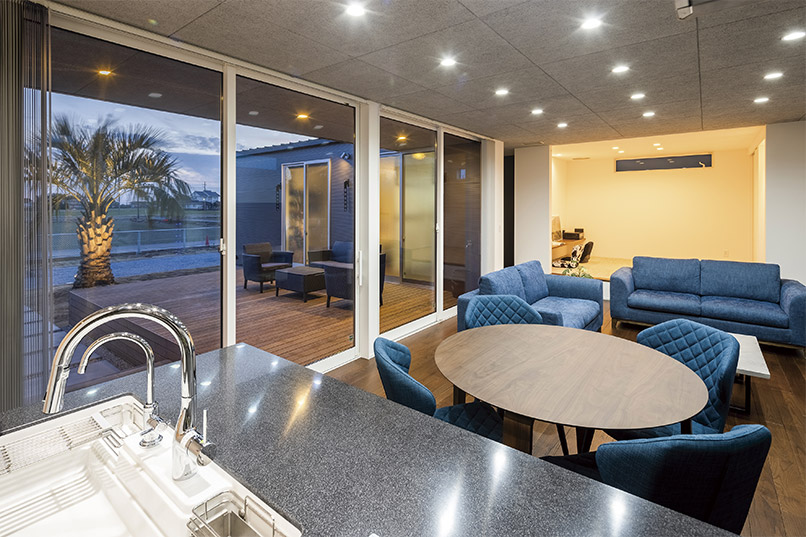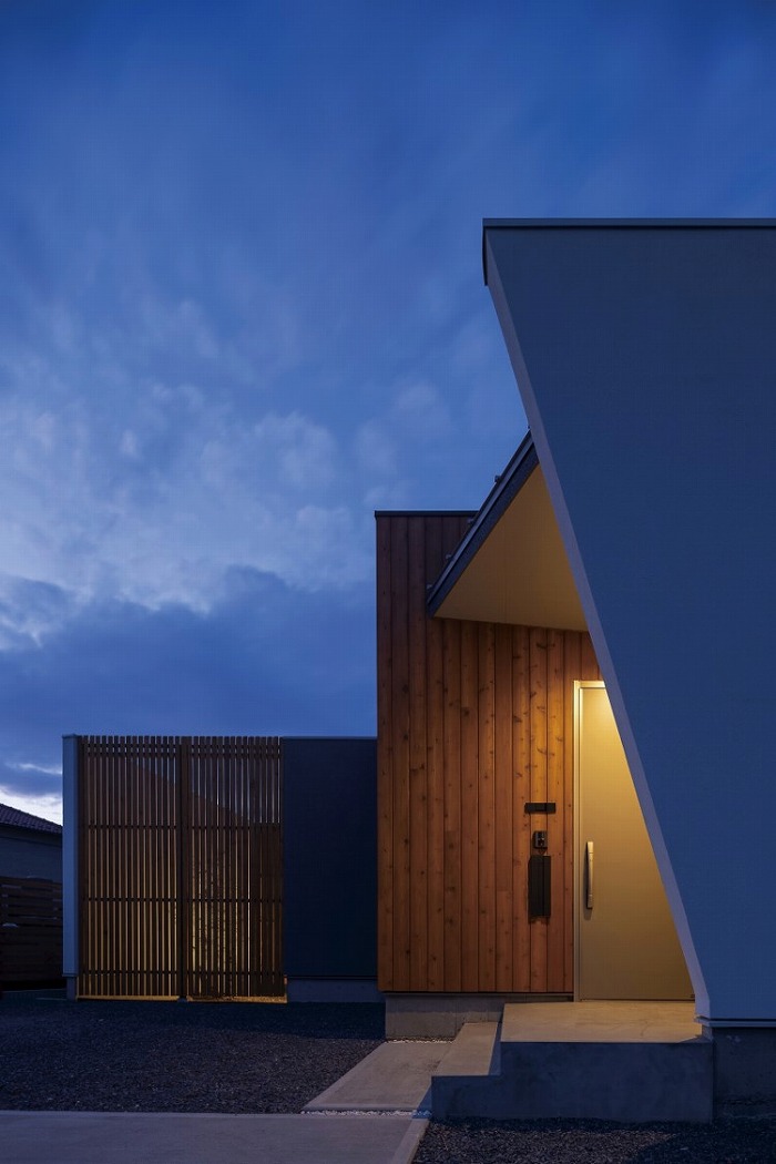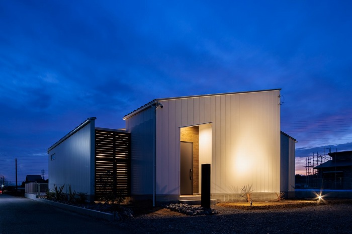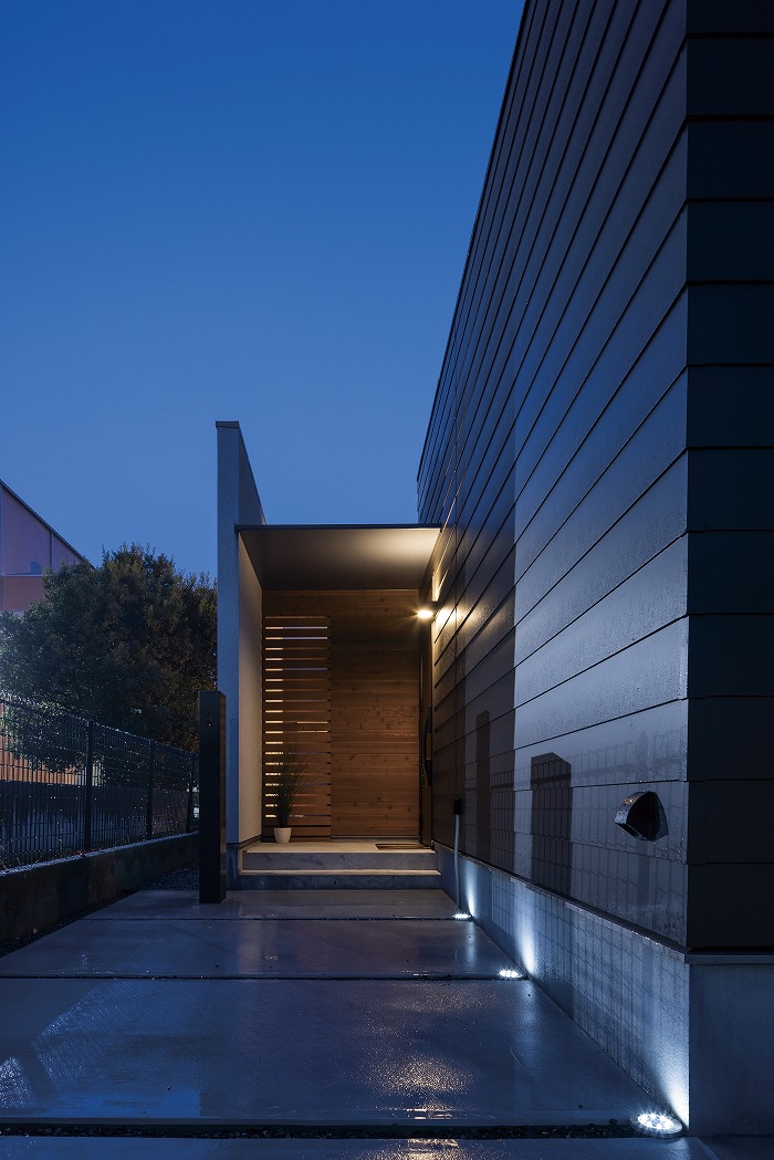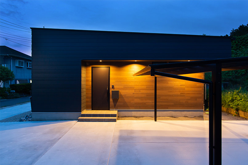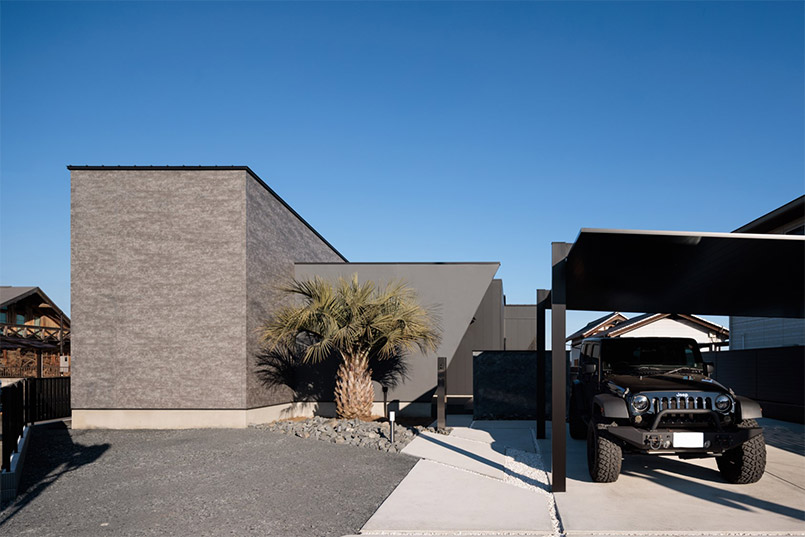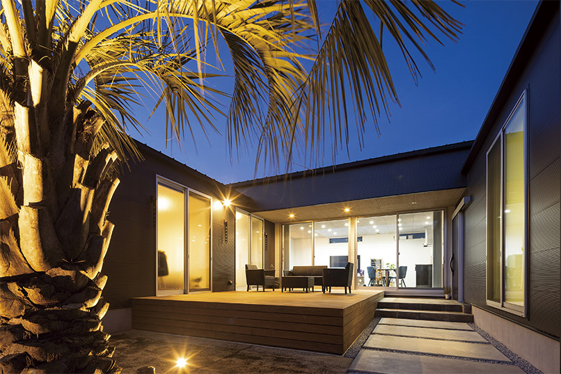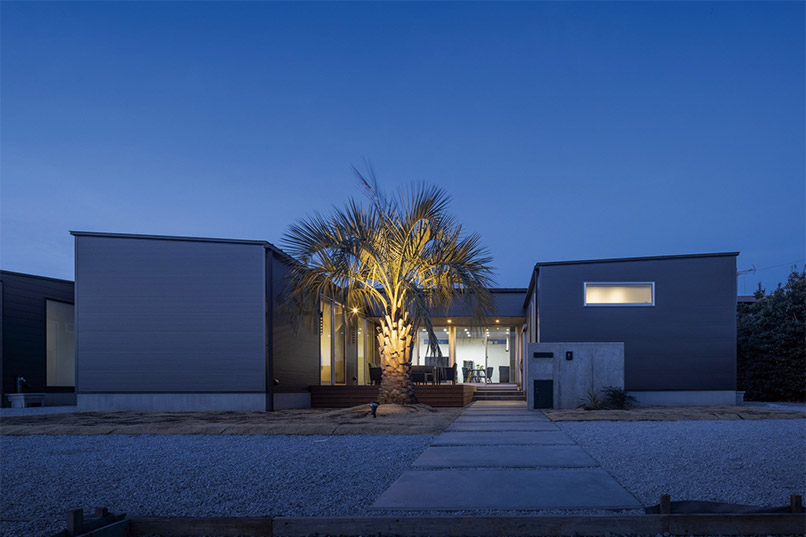 まるでギャラリーや一軒家レストランのようなクールな佇まいの平屋が完成しました。外観はテクスチャーの異なる外壁材を組み合わせ、大胆に斜めにカットした壁や室内の灯りがもれる格子がアクセント。シンボルツリーのココスヤシをライティングすると、壁面に浮かび上がる陰影が建物をより引き立てます。