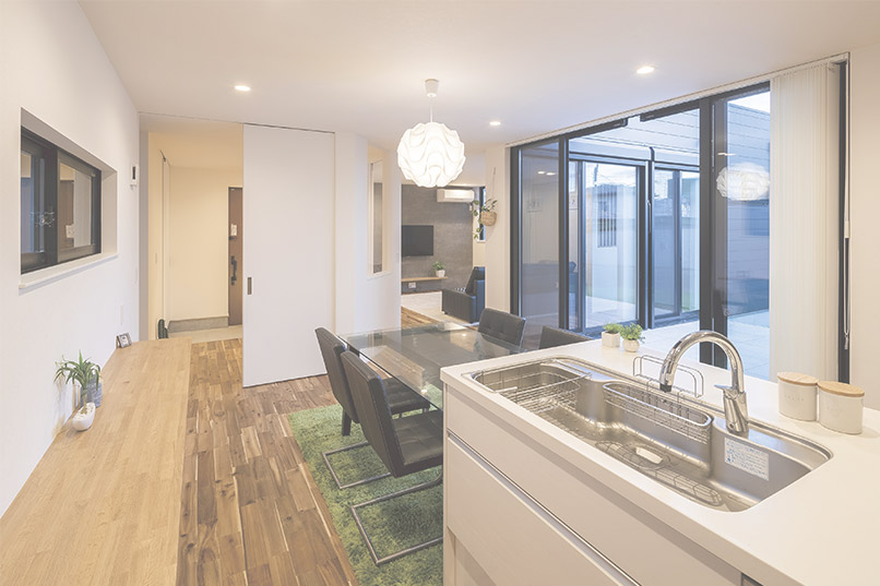 室内は、仕切りや廊下を極力省いた開放感のあるLDKに中庭から光が降り注ぎ、センスの良い家具を置けばまるでインテリアショップのようなおしゃれな雰囲気に。「ヴィンテージ&モダン」という相反するものが共存する遊び心満載の家が完成しました。
