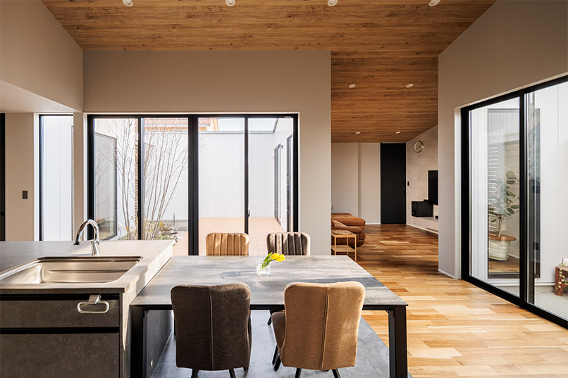 建物の中心に中庭を設けることで、外側に大きな窓をつくらなくても光を取り込むことが可能となり、同時に外部からの目線を気にせず開放感のある室内を実現できました。外観はブラックのガルバリウムとレッドシダーでメリハリのある印象に。